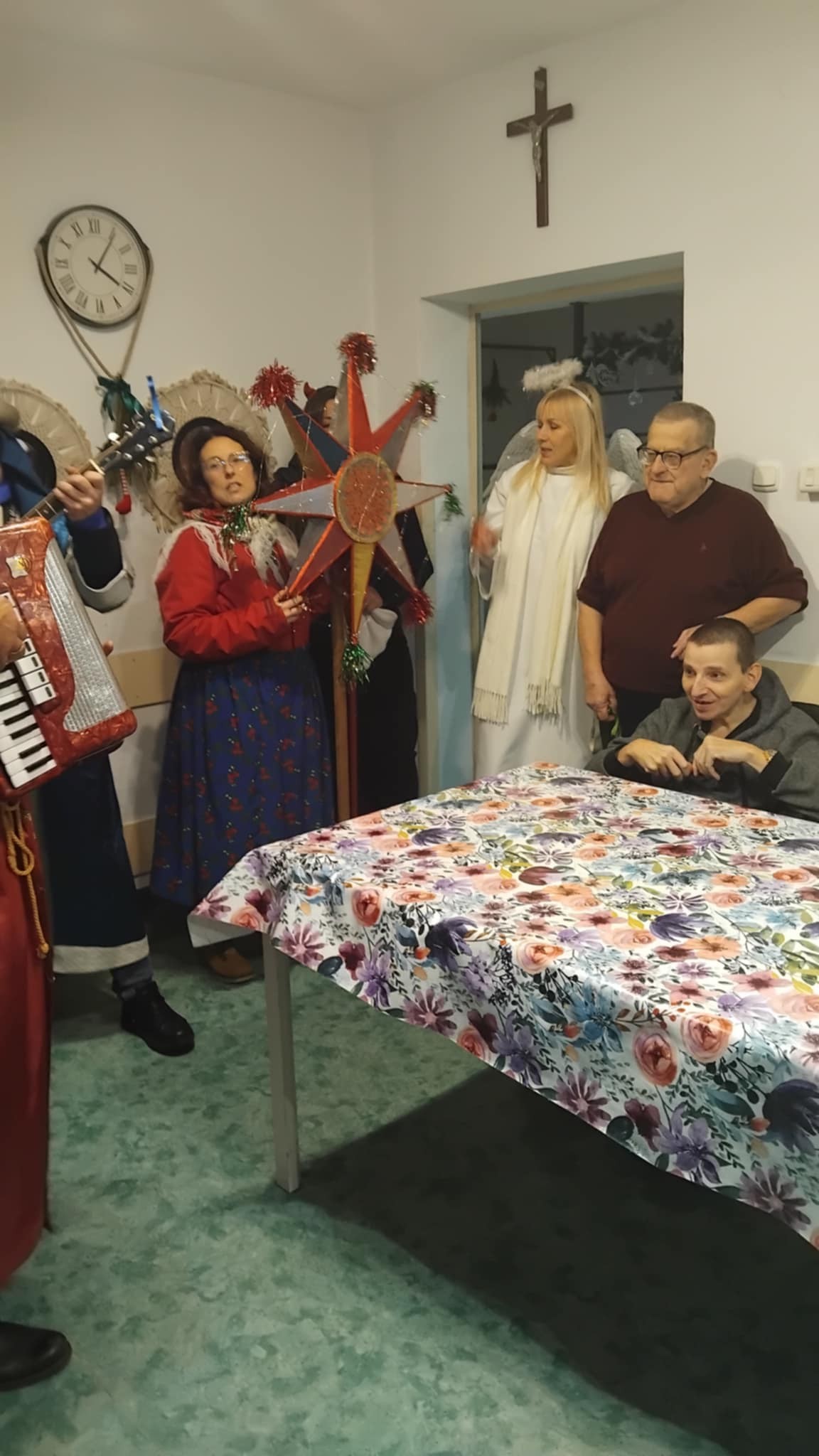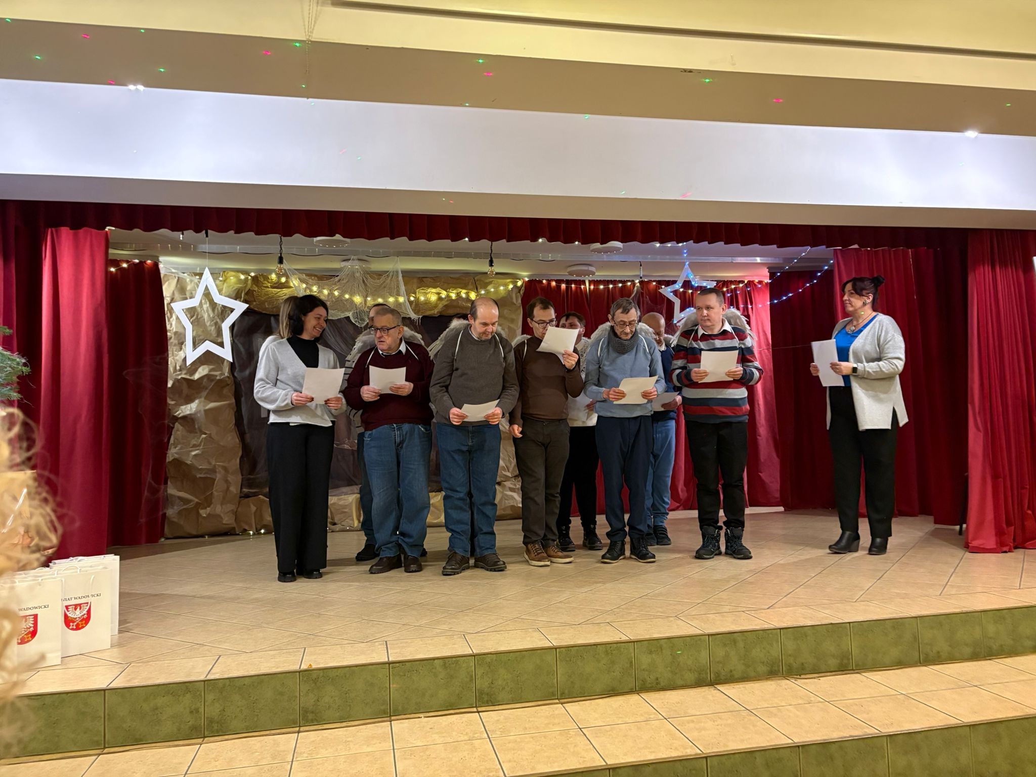 Nasi mieszkańcy DPS oraz uczestnicy WTZ aktywnie uczestniczyli w spotkaniu wykonując na scenie kolędę „Gdy się Chrystus rodzi”.