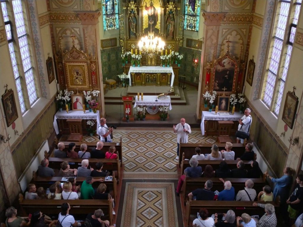 Podczas zwiedzania nie zabrakło anegdot, odniesień do zachowanych dokumentów, ale i wspomnień mieszkańców, które Pan Jan pieczołowicie gromadzi.