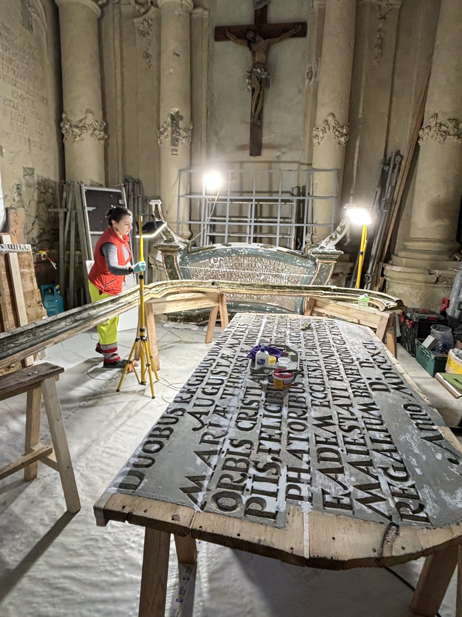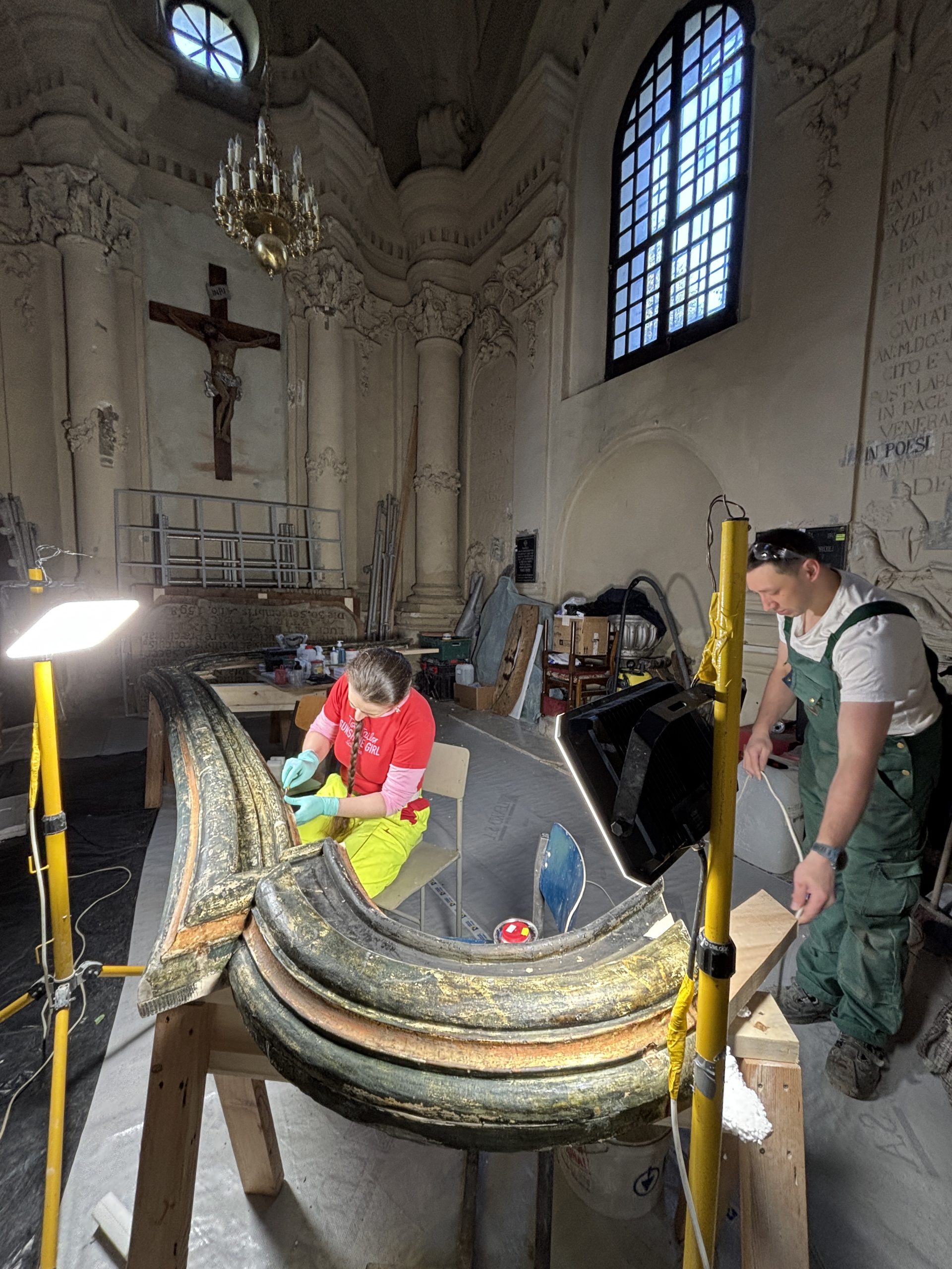 Tablice zostały zdemontowane i rozłożone na części, co umożliwiło dotarcie do każdego, nawet najmniejszego elementu. Specjaliści oczyszczają powierzchnie, uzupełniają ubytki, scalają warstwy malarskie i przywracają barokowym zdobieniom ich dawne bogactwo. Wraz z postępem prac coraz wyraźniej ukazują się jaśniejsze tony, dawny koloryt oraz złocenia detali snycerskich.