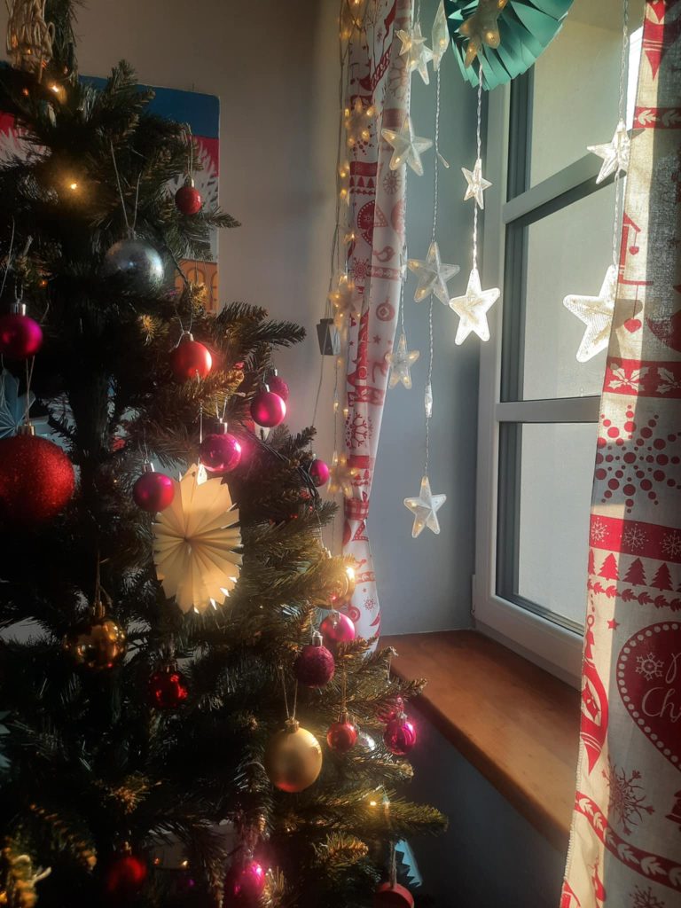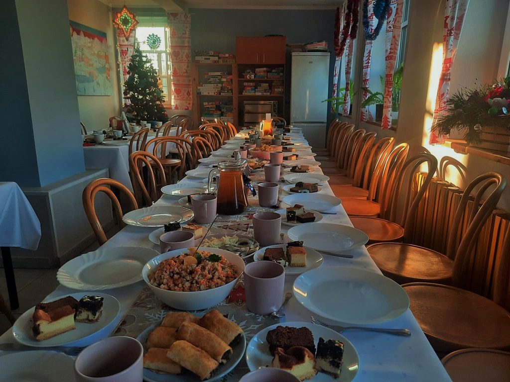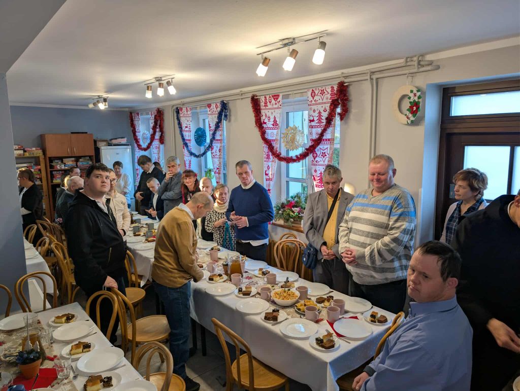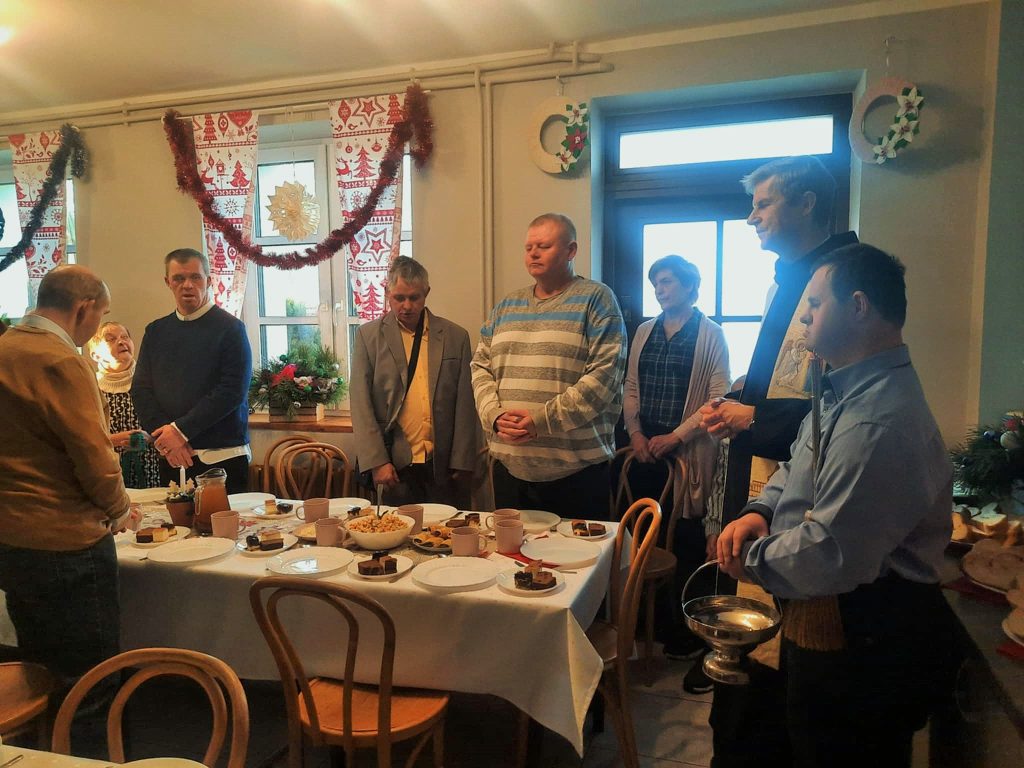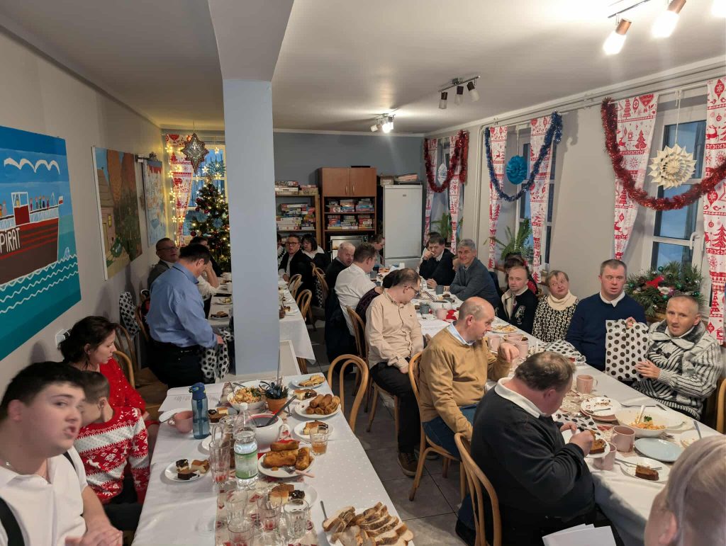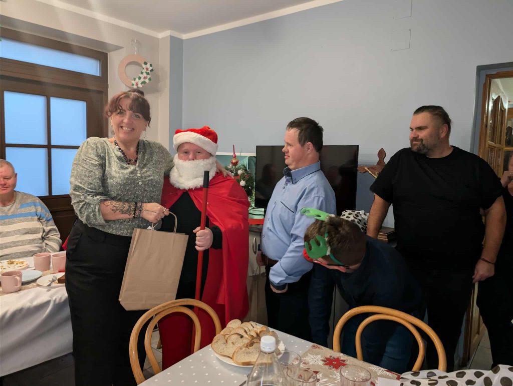 Rozpoczęliśmy tradycyjnie od modlitwy i składania sobie życzeń. Na stole przygotowane były dania świąteczne: czerwony barszczyk, krokiety z kapustą i grzybami, chałka, kompot z suszu oraz ciasto. Po posiłku rozpoczęliśmy kolędowanie przy akompaniamencie akordeonu w wykonaniu Pani Honoraty, mamy naszego kolegi. Serdecznie dziękujemy Pani Honoracie za artystyczne wsparcie i życzliwość, którą nas darzy. Niespodziewanie podczas świętowania zjawił się także Święty Mikołaj, który obdarował nas prezentami. Dziękujemy za te piękne chwile!